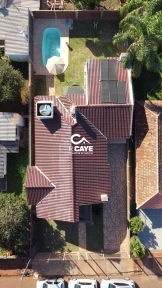 Possui laje e cobertura de telha cerâmica americana.