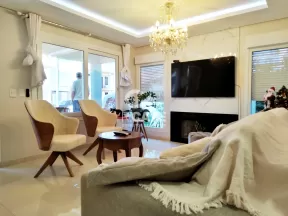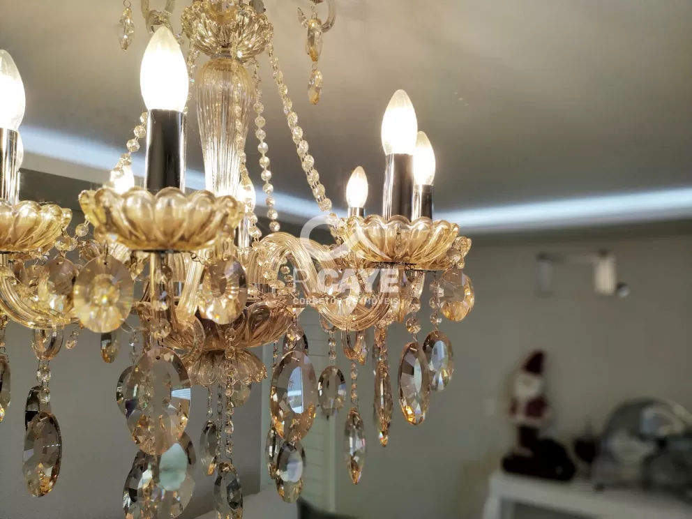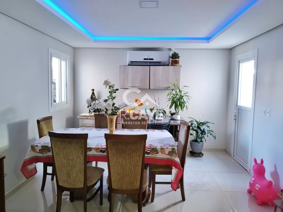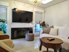 A sala possui um lindo lustre, lareira com acabamento em granito e porcelanato marmorizado.