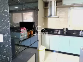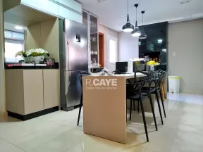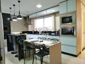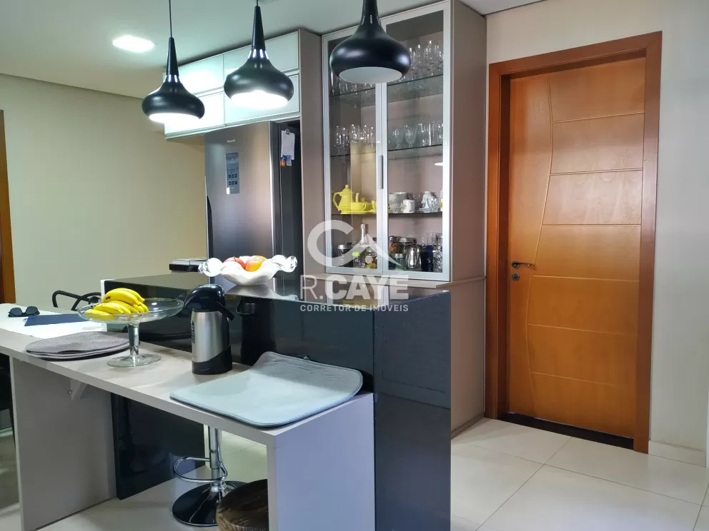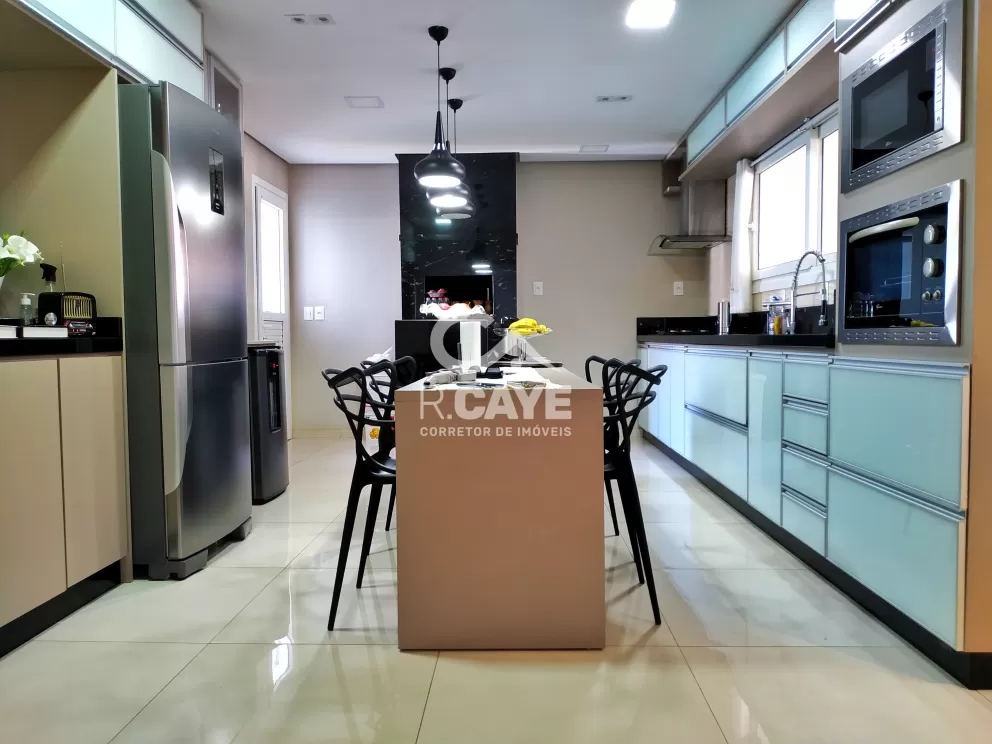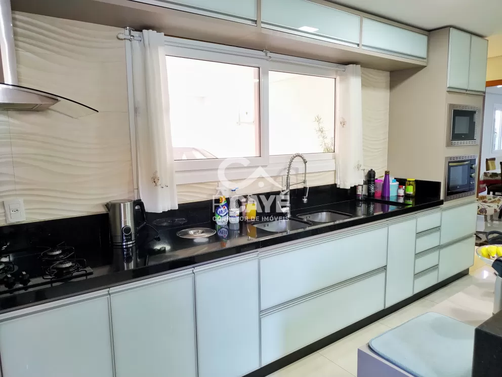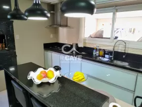 A cozinha é toda planejada, possuindo bancada central, cristaleira e churrasqueira. Todas as superfícies possuem pedra de granito em especial a churrasqueira.