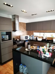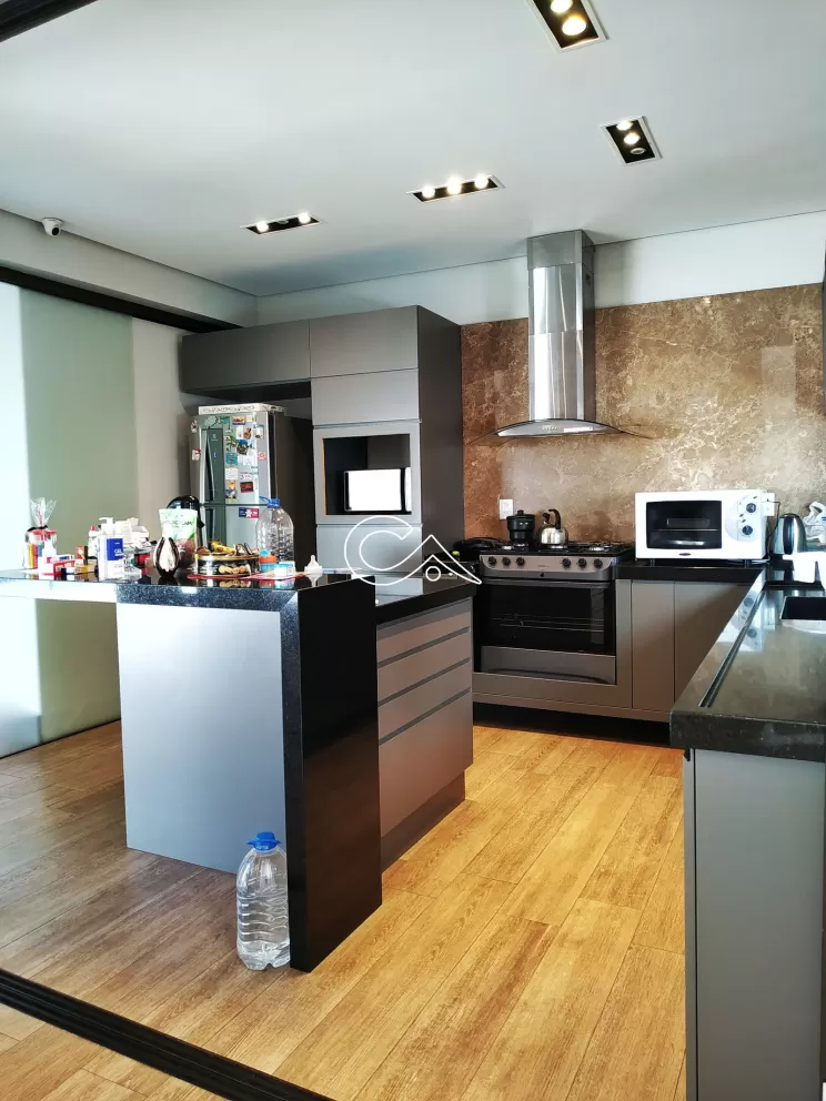 A cozinha é toda planejada com móveis Shuster, possui bancada e todas as superfícies são em granito.